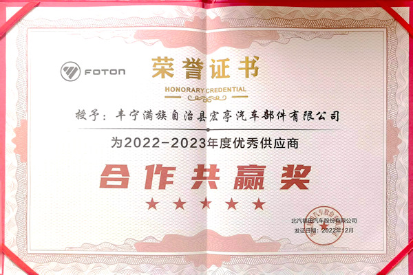 豐寧宏亭公司榮獲北汽福田汽車股份有限公司 “2022-2023年度優(yōu)秀供應商合作共贏獎”